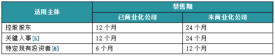 上市制度中对特专科技公司的控股股东的禁售做出了更严格的规定,即,对于已商业化公司约定了为期12个月的禁售期,对于未商业化公司则约定了为期24个月的禁售期,同时取消了对于特专科技公司控股股东限售期的相关规定。此外,上市制度还对创办人、不同投票权受益人、执行董事及高级管理人员、主要技术运营及研发人员等可能影响公司发展的关键人事的持股做出了类似的禁售规定。同时,满足特定条件的现有投资者(依据《指引信》,主要为领航资深独立投资者)也将受到一定期限的禁售限制。具体如下: