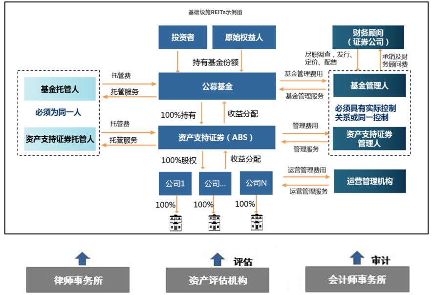 这种交易架构并非国际通行的REITs架构,公募基金和ABS的双层架构可能会带来额外的交易成本。为避免公募基金管理人和ABS管理人之间的利益博弈带来的额外的交易成本和潜在纠纷,相关法律规定基金管理人和ABS管理必须是具有实际控制关系或同一控制下的关联方。同理,公募基金的账户托管人和ABS的账户托管人也必须是同一主体。