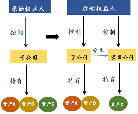 2. 公司存续分立:从原始权益人或其子公司中分立出项目公司,并将拟发行REITs的基础设施项目一并转移给项目公司,具体如下图所示: