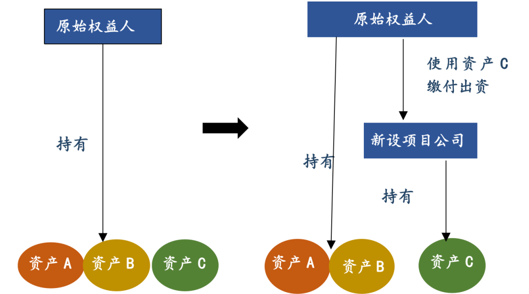3. 以资产出资:原始权益人以其对特定基础设施项目的所有权缴付项目公司的出资,并取得项目公司的股权(即作价入股),具体如下图所示: