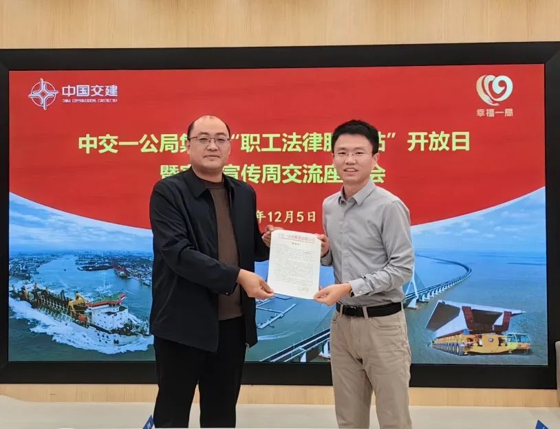 中交一公局集团“职工法律服务站”于2023年12月5日揭牌设立,是公司深化“法治一局”建设,助力保障“幸福一局”目标实现的重要举措,为公司深入开展全员普法、做实职工权益维护、抓好服务队伍建设提供了阵地保障。