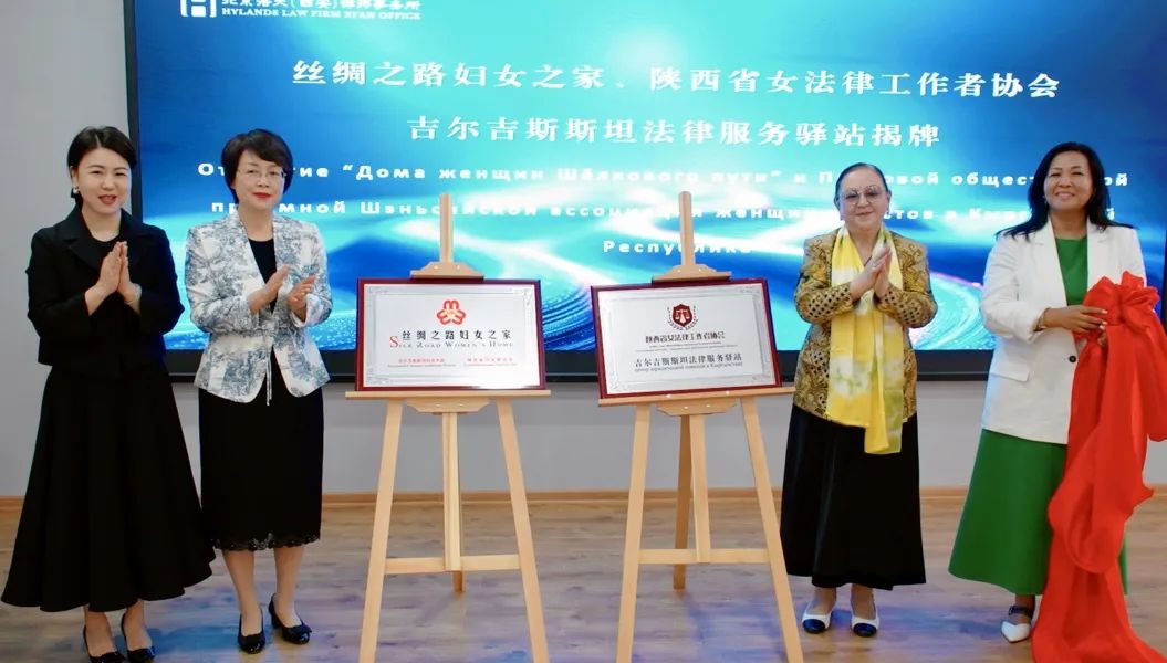 王玉娥主席、阿克巴吉舍娃主席、阿依扎主任、刘洁会长共同为 “丝绸之路妇女之家”“陕西省女法律工作者协会吉尔吉斯斯坦法律服务驿站” 揭牌,标志着中吉跨境法律服务与妇女交流平台正式落地。