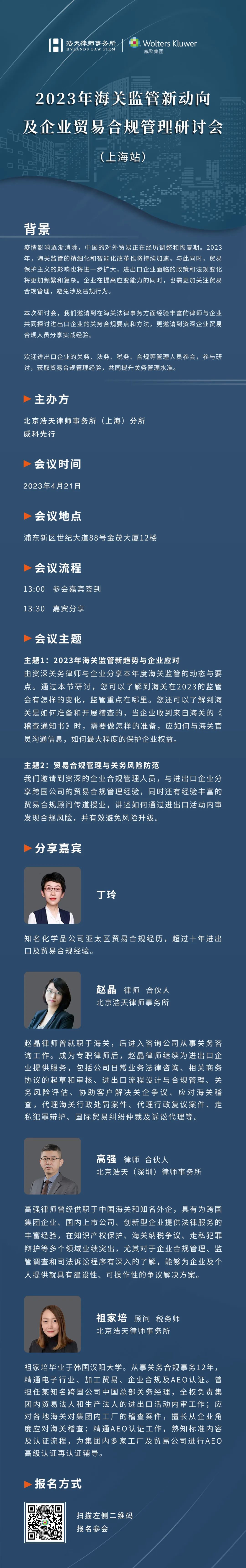 浩天论坛 | 2023年海关监管新动向及企业贸易合规管理研讨会(上海站)