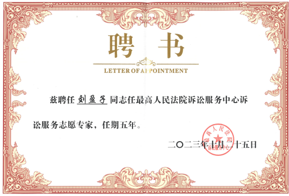 北京浩天律师事务所高级合伙人刘盈子律师、合伙人余昉律师以及律师陈立意通过中国法学会组织推荐、审核及备案,作为诉讼服务志愿专家获得了最高人民法院诉讼服务中心颁发的聘书,任期为五年,自2023年10月起至2028年10月止。