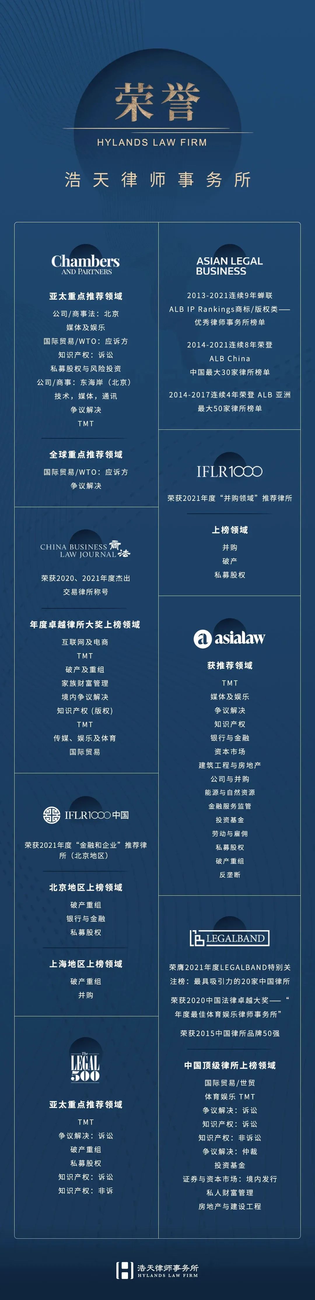 2024年2月15日,国际权威法律评级机构钱伯斯(Chambers & Partners)公布了《钱伯斯全球指南2024》(Chambers Global 2024)榜单,北京浩天律师事务所“争议解决”、“国际贸易/WTO:应诉方”两项业务领域荣登推荐榜单;八位合伙人荣登重点推荐律师榜单。