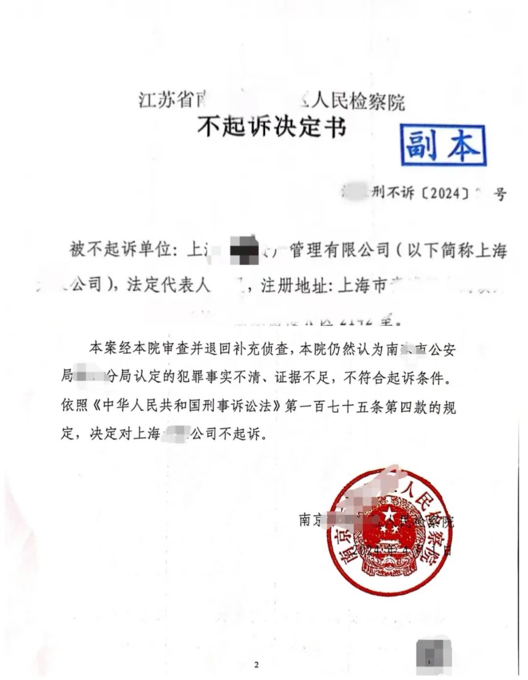 浩天为涉嫌“背信运用受托财产罪”的私募基金公司辩护成功获得不起诉决定书