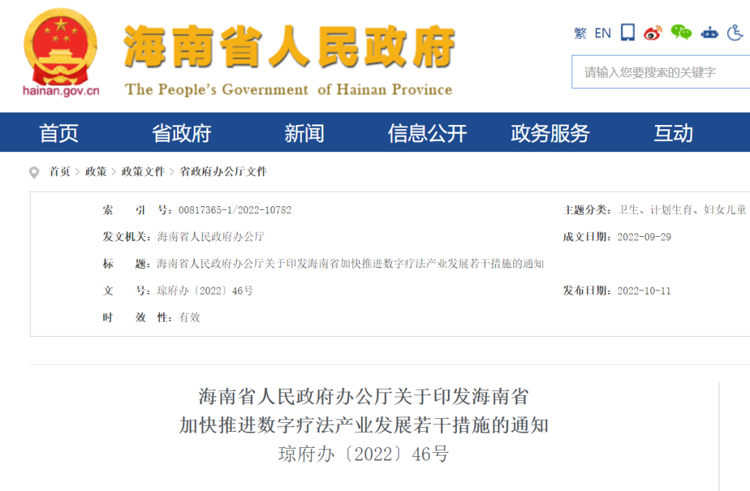 为贯彻落实习近平总书记在庆祝海南建省办经济特区30周年大会上关于“海南要深化供给侧结构性改革,发挥优势,集聚创新要素,积极发展新一代信息技术产业和数字经济”的讲话精神,抢抓历史机遇,通过2-3年的努力将海南建设成为全球数字疗法创新岛、创新资源集聚区和产业高地,将数字疗法打造成海南健康产业高质量发展的“新引擎”,推动海南卫生健康跨越式发展和实现“十四五”期间人均预期寿命提高两岁的目标,海南省人民政府办公厅特制定加快推进数字疗法产业发展的若干措施。