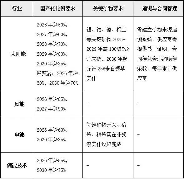 法案通过阶梯式国产化比例要求,强制新能源企业减少对受禁外国实体的依赖。企业需建立完整的供应链追溯系统,并定期审计供应商,否则可能丧失税收抵免资格。关键矿物的加工环节也受到严格限制,2025-2029年必须完全脱离受禁实体。
