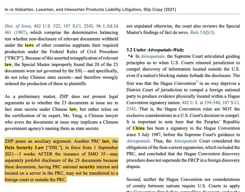 本案背景为关于在中国创建的23份文件中是否有一份是《国家机密法》下的国家机密,如果是,《国家机密法》是否因此规范了他们在本次诉讼中的不披露。争论点是《联邦民事诉讼规则》,特别是规则26——公正和透明地确定美国民事诉讼中的每项诉讼和程序与中国《国家机密法》的矛盾。美国法院进行调查取证,中国当事人以中国《国家机密法》规定为由提出抗辩,中国当事人声称,自2021年9月1日起生效的《数据安全法》与《国家机密法》,禁止披露这23份文件,因为这些文件具有中华人民共和国国家安全利益,位于中华人民共和国的服务器上,不得转让给外国法院或中华人民共和国以外。